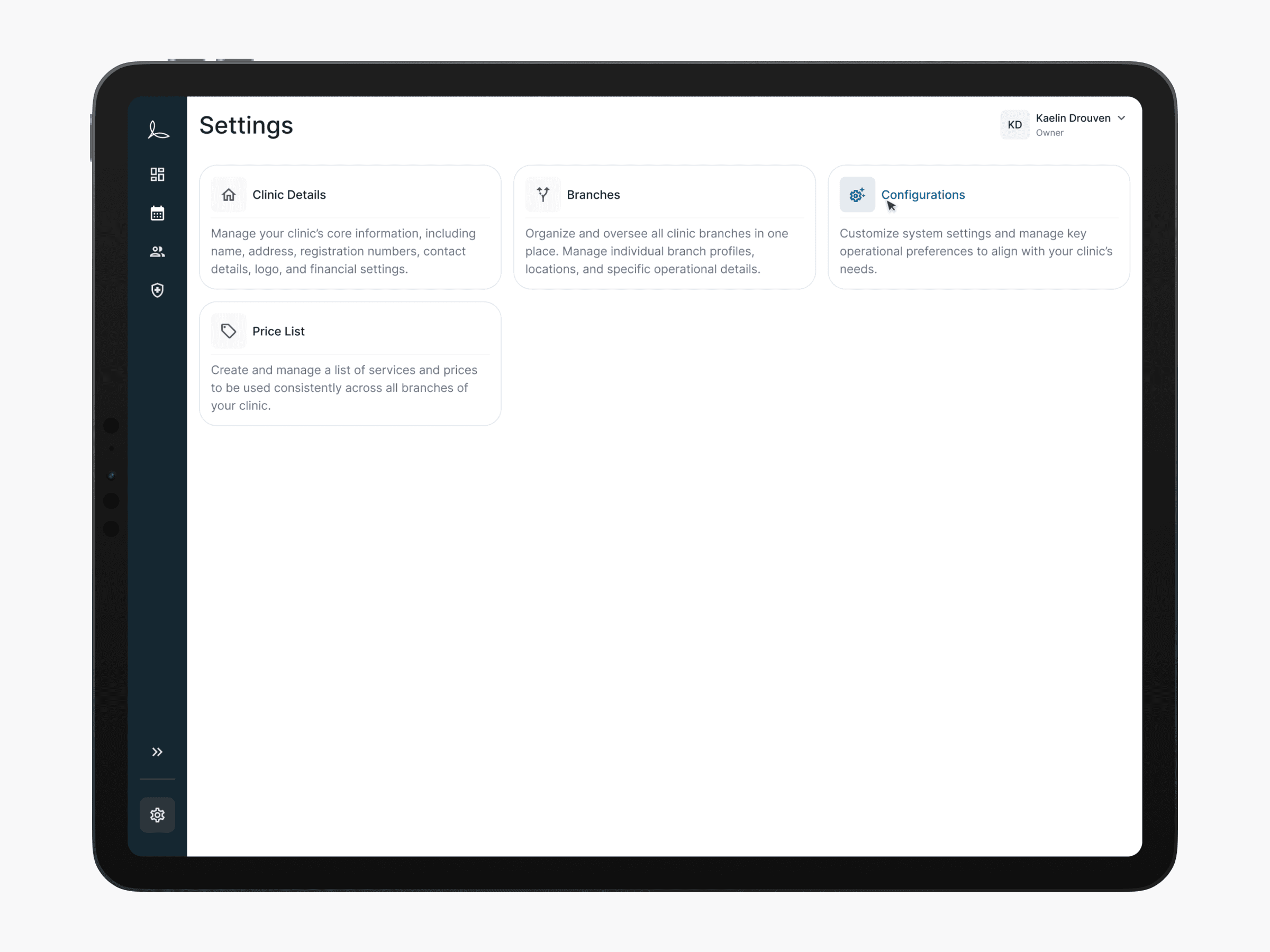 We designed the settings section to give clinics full control over how the system works for them. It allows users to manage key details like employees, services, and pricing, making it easy to adjust things based on the clinic’s needs and workflow.