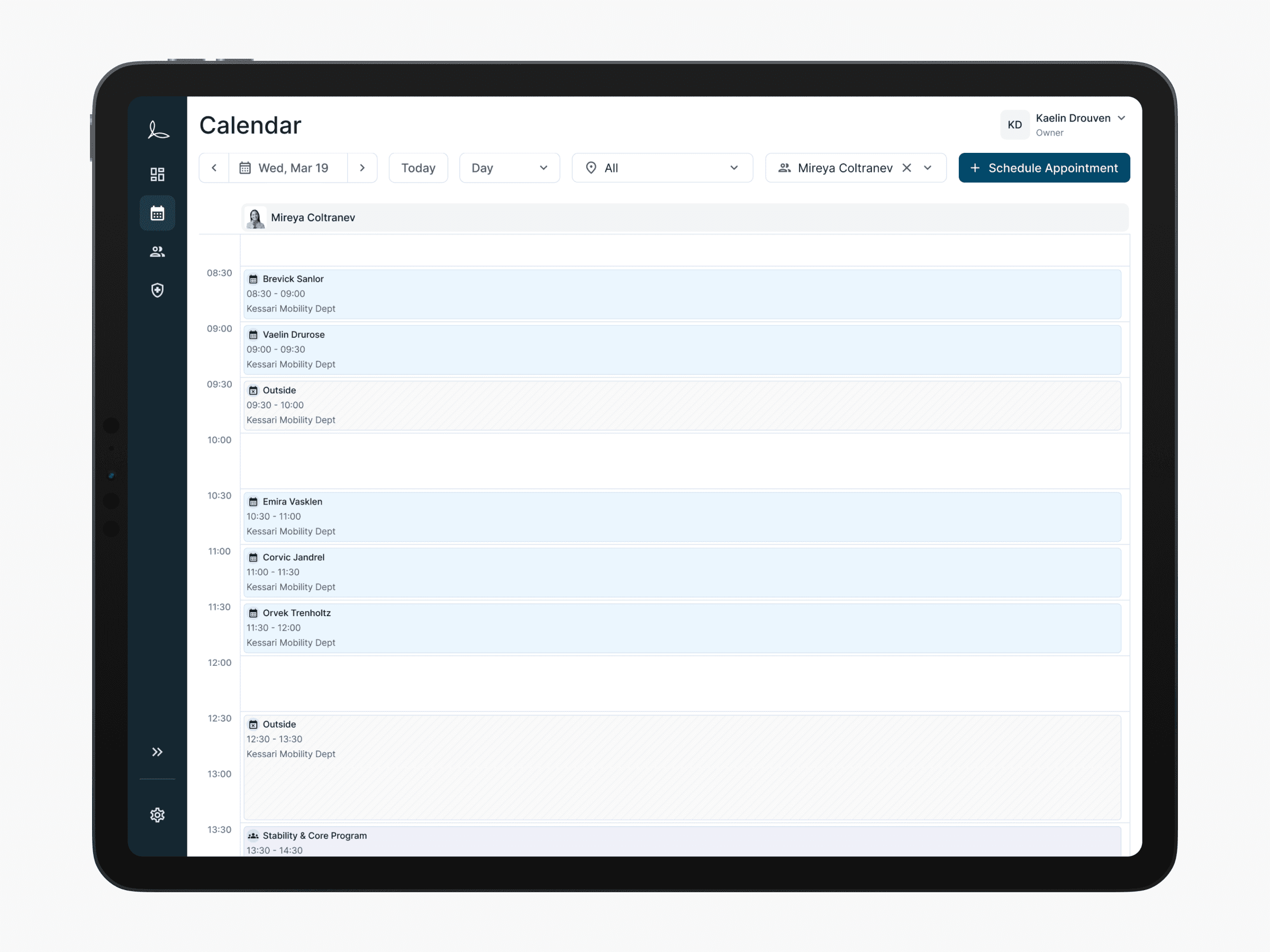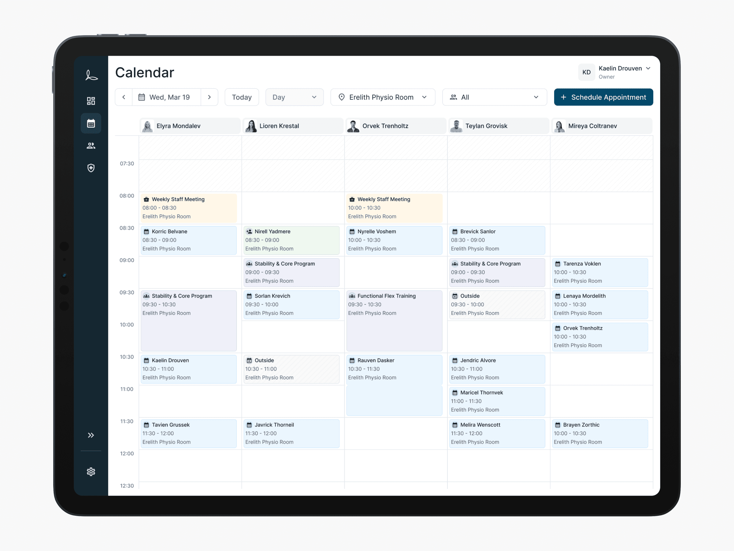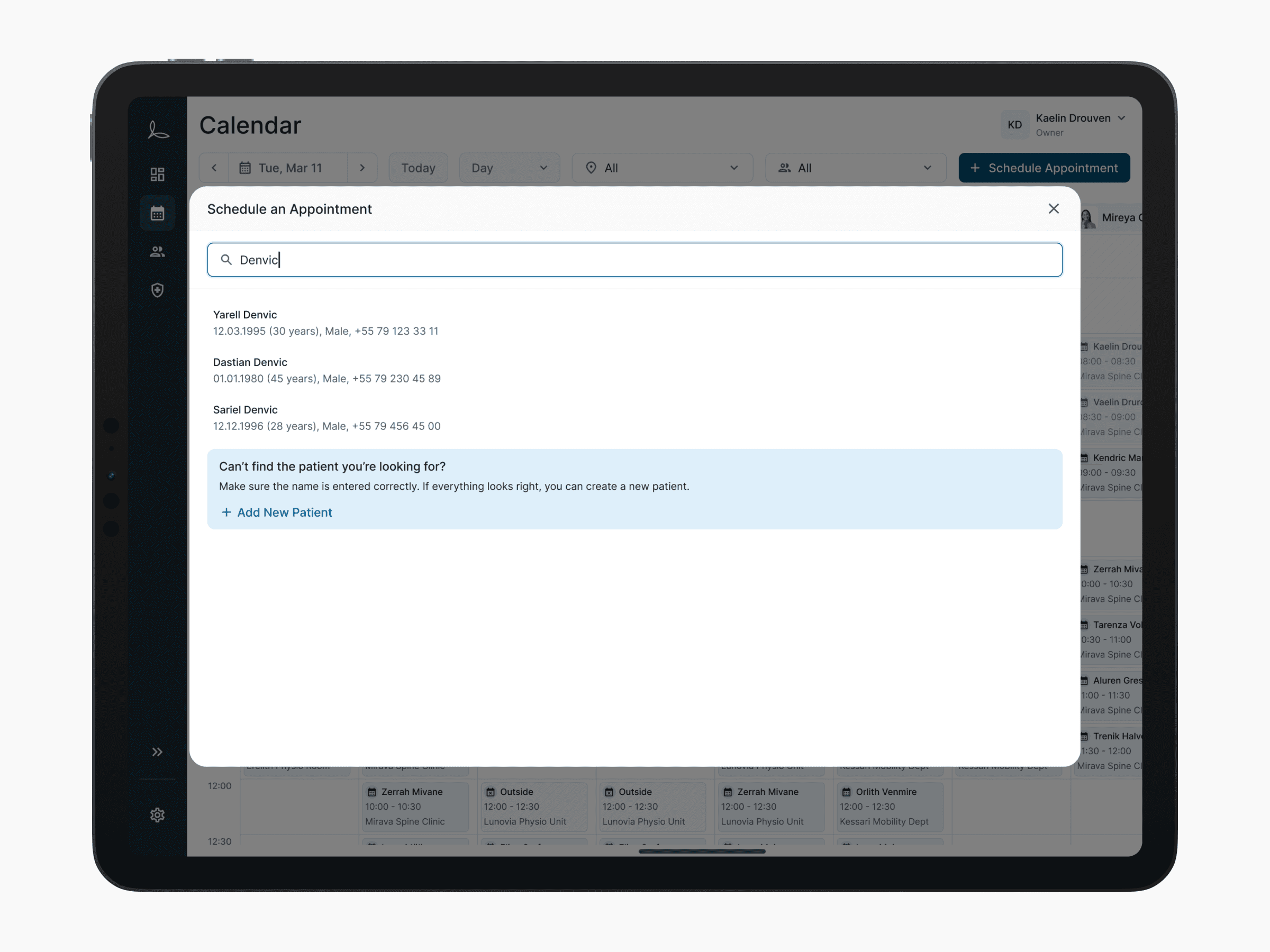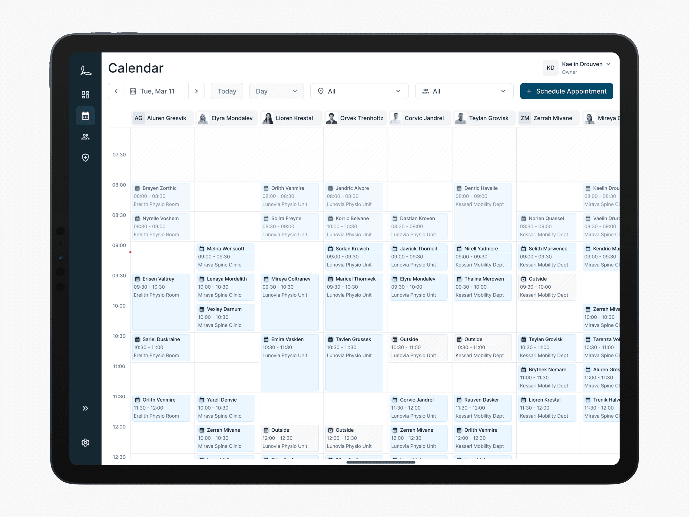 Each role can customize the calendar view depending on their needs. For example, doctors can choose to see only their own appointments, while admins can view the full schedule for the clinic.