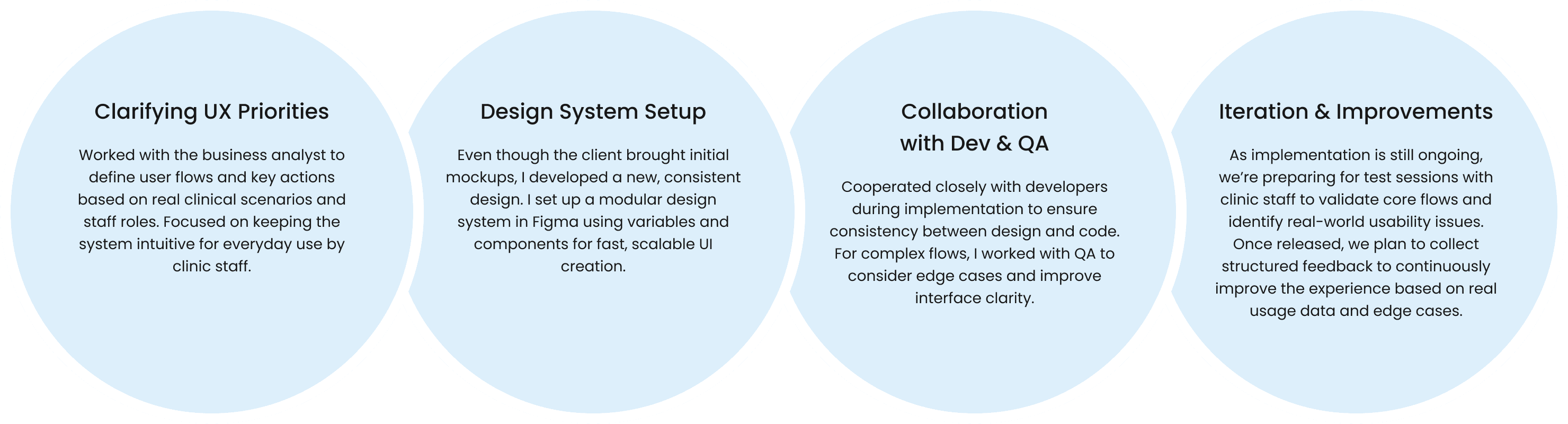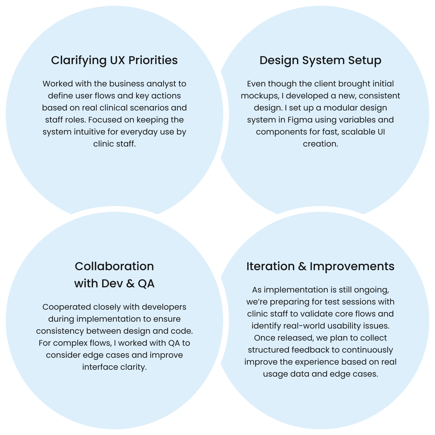 Each module was researched and designed separately. We made sure the solutions were user-friendly and also possible to implement on the backend, so the system could work in a real clinic.