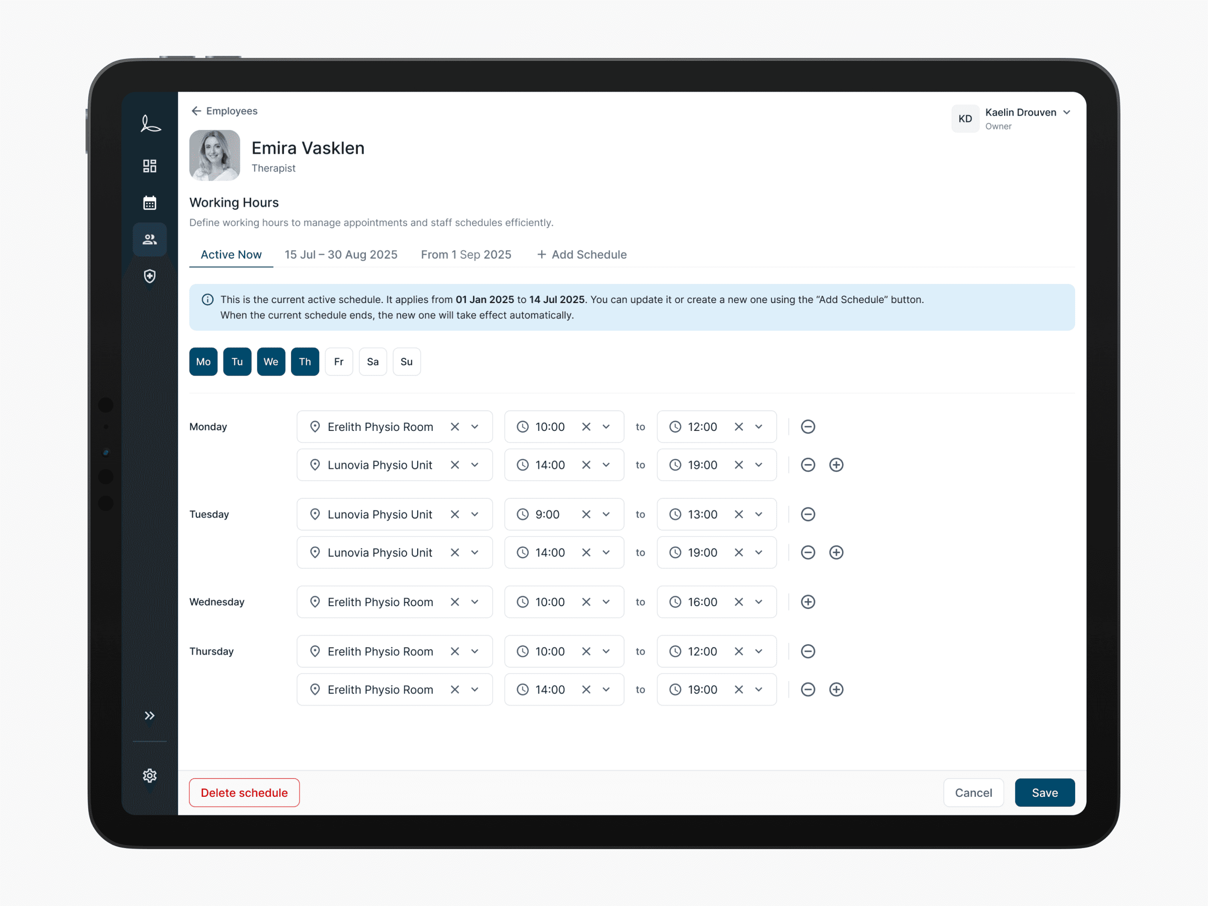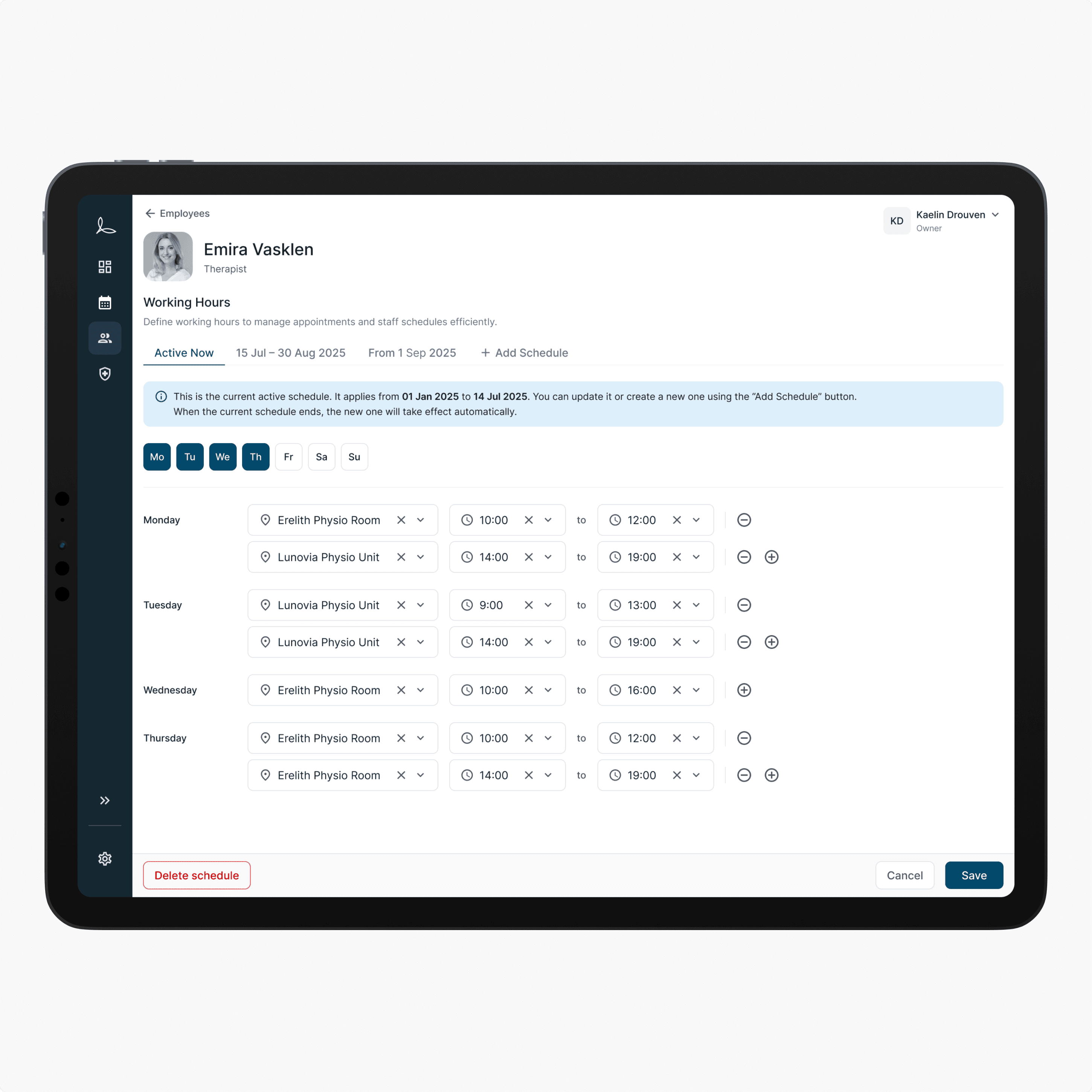 The schedule for each employee is linked to the working hours of their branch. We carefully thought through different scenarios to make sure there are no conflicts and everything works as expected.