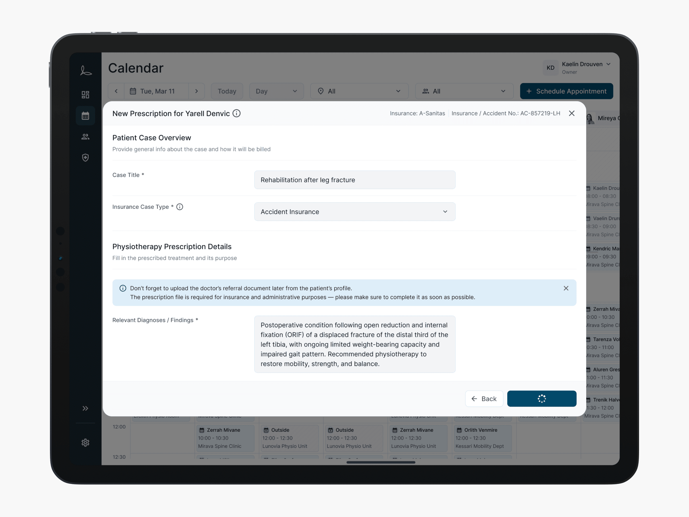 A specialized platform built to streamline daily operations in physiotherapy clinics. The system supports case tracking, appointment scheduling, prescription processing, and insurance validation, helping teams stay organized, compliant, and efficient.