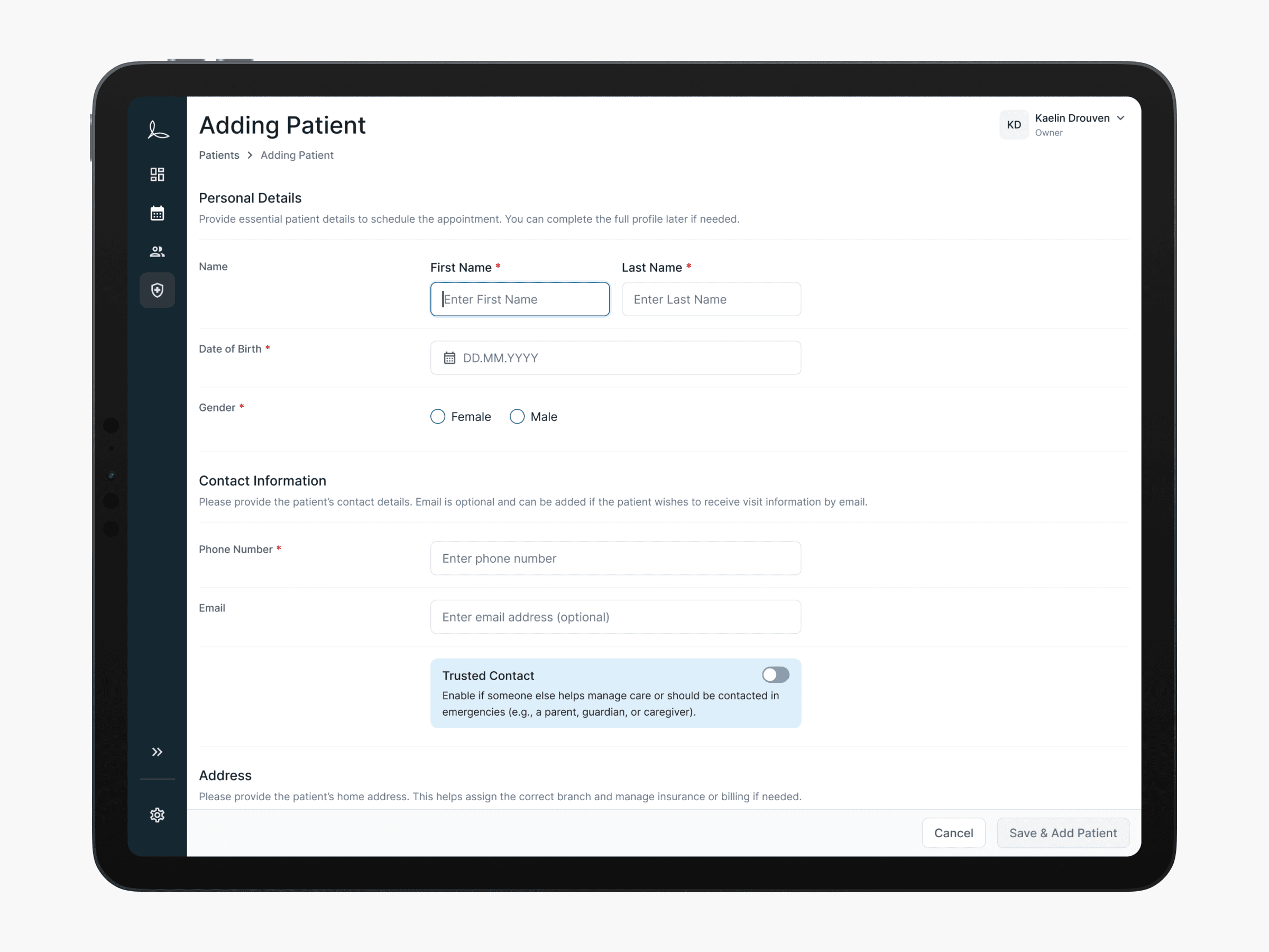 This section helps clinics keep everything about their patients in one place. Staff can easily add new patients, view the full list, and open each patient’s profile.