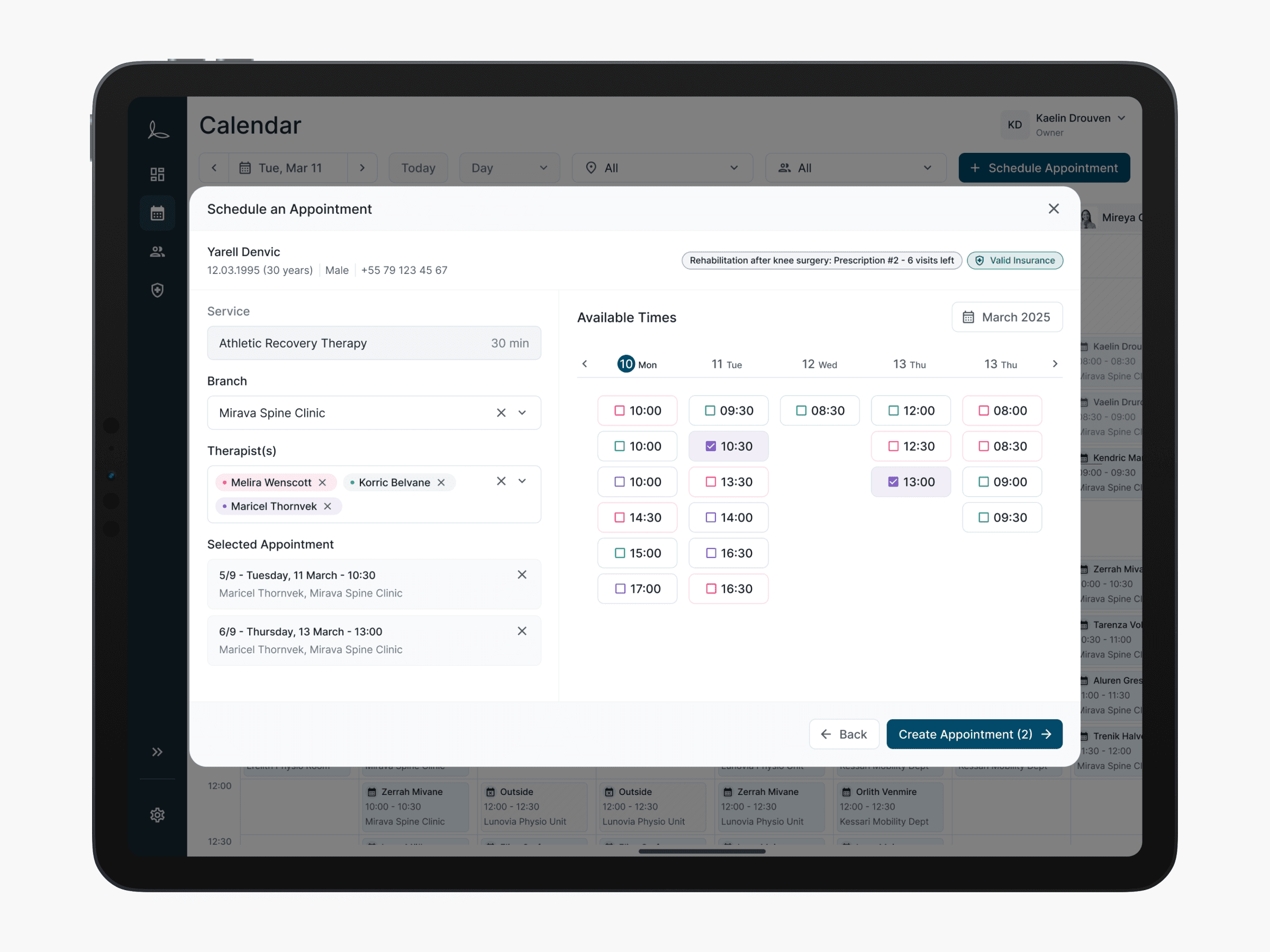 The system also supports booking multiple appointments at once. This helps when a prescription includes several visits, allowing staff to schedule everything in advance and keep the treatment plan organized.