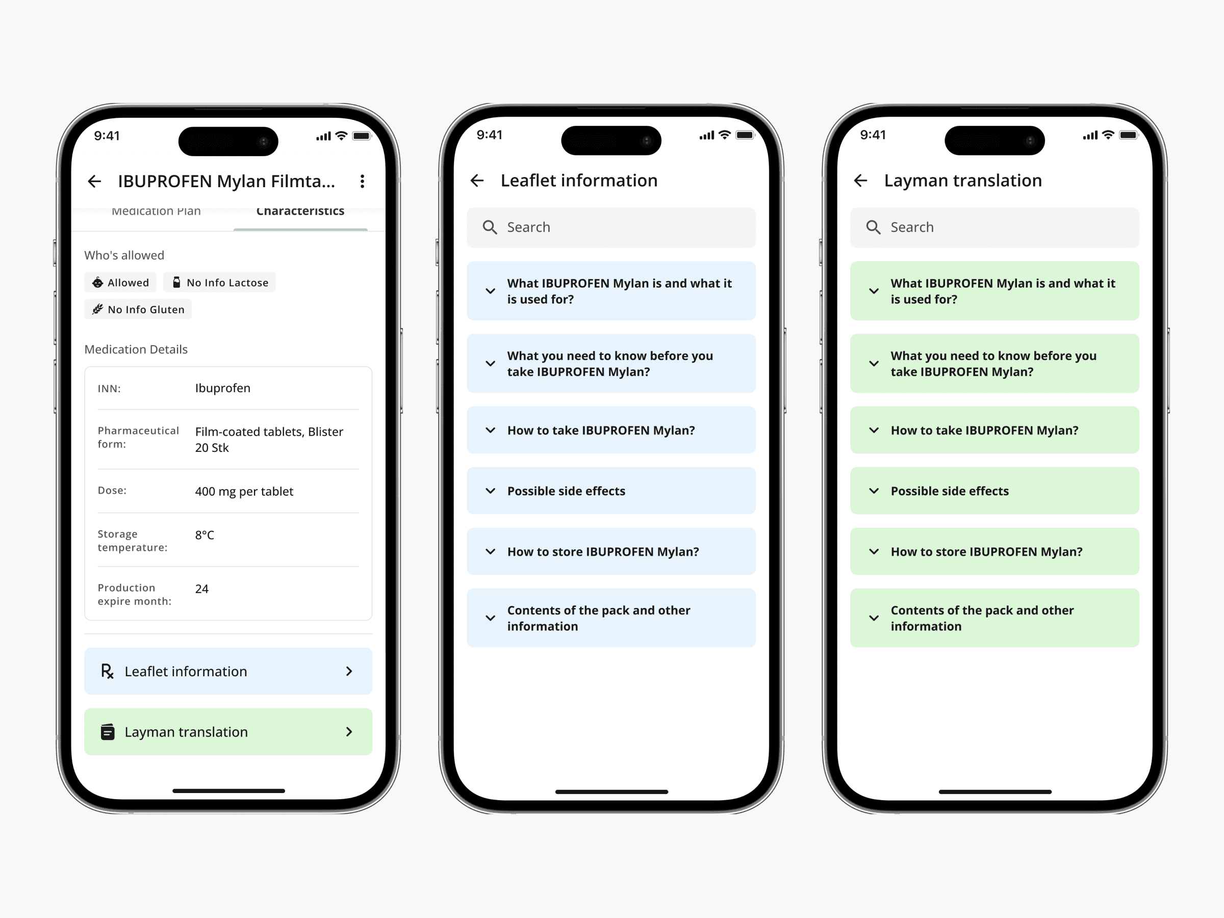 The Medication card provides users with key details about their medication. It includes basic drug information along with the Leaflet Information and Layman Translation functions. These features make drug instructions easier to understand, regardless of medical knowledge. The Layman Translation simplifies complex terms, helping users read and follow instructions with ease, ensuring safe and informed medication management.