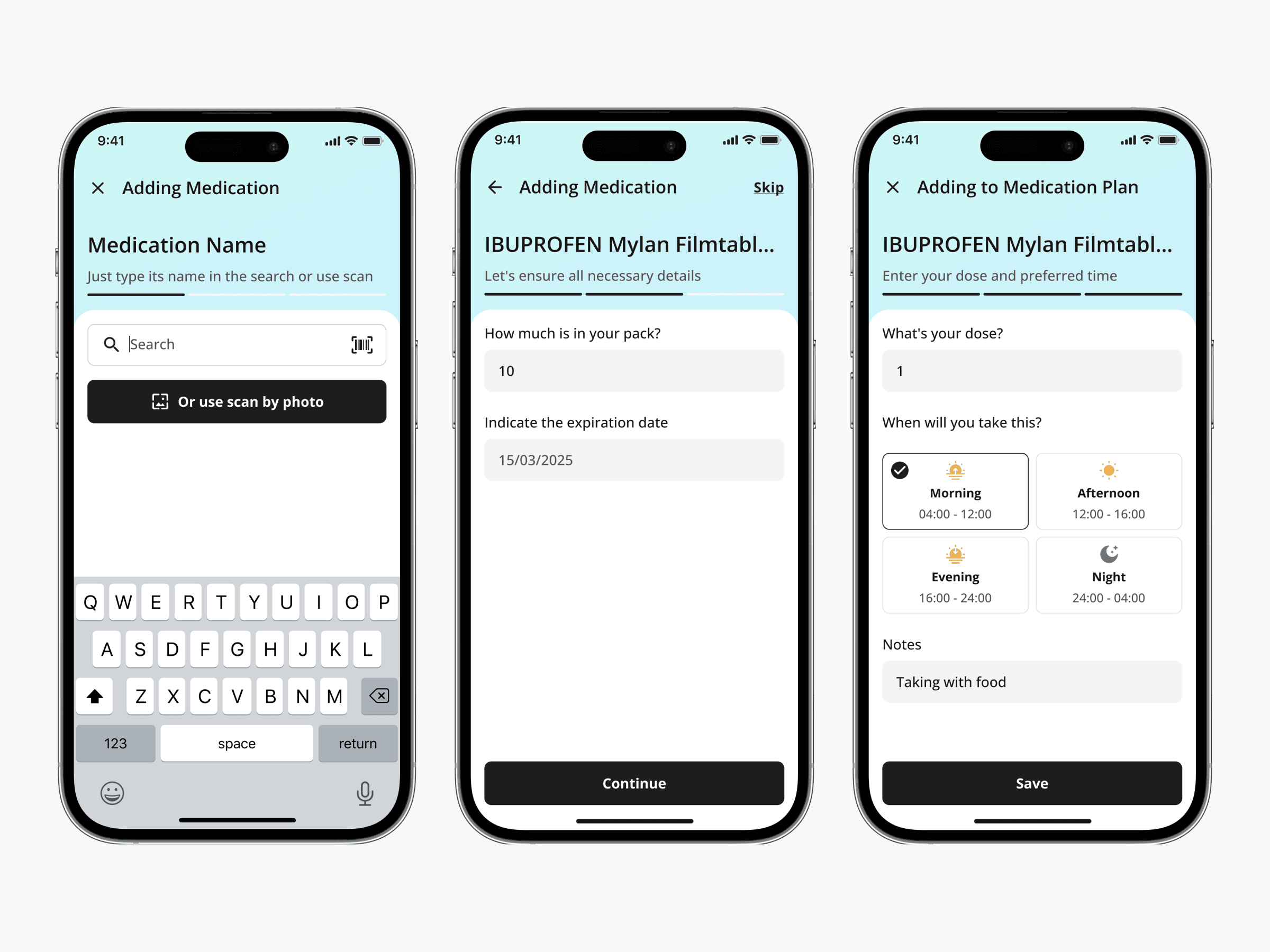 As an MVP, our main focus was to make sure users can easily log, track, and manage their medications, expiration dates, and instructions, all in one place. The idea was to keep things as simple as possible, so users don't have to deal with unnecessary steps or complexity.