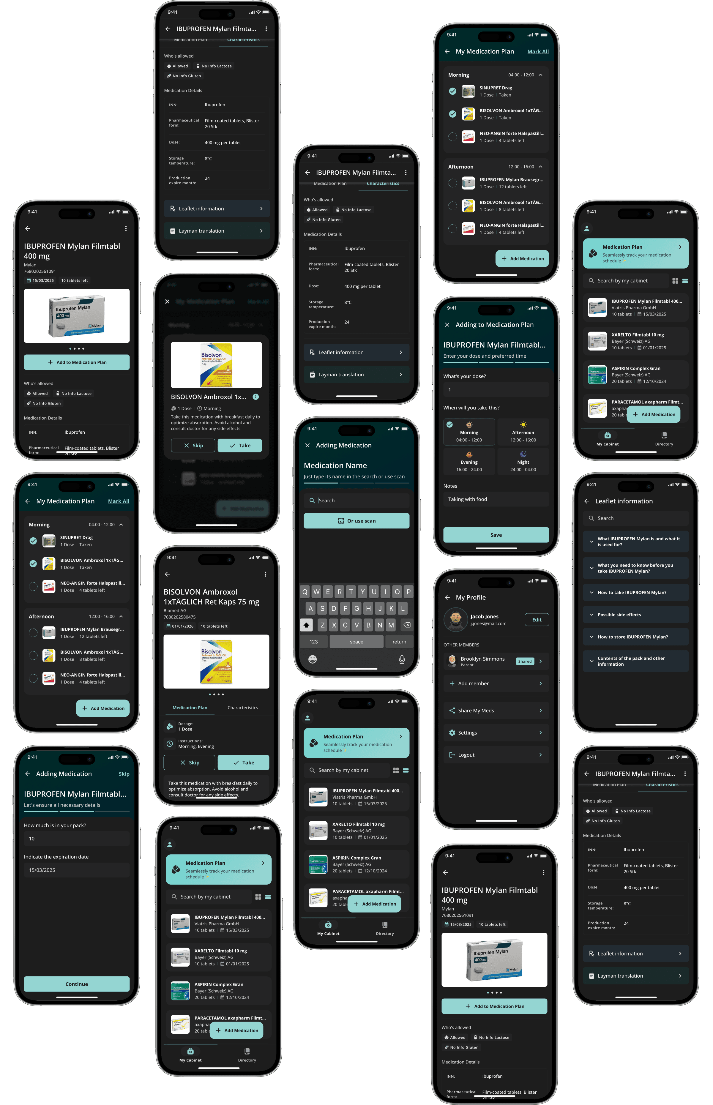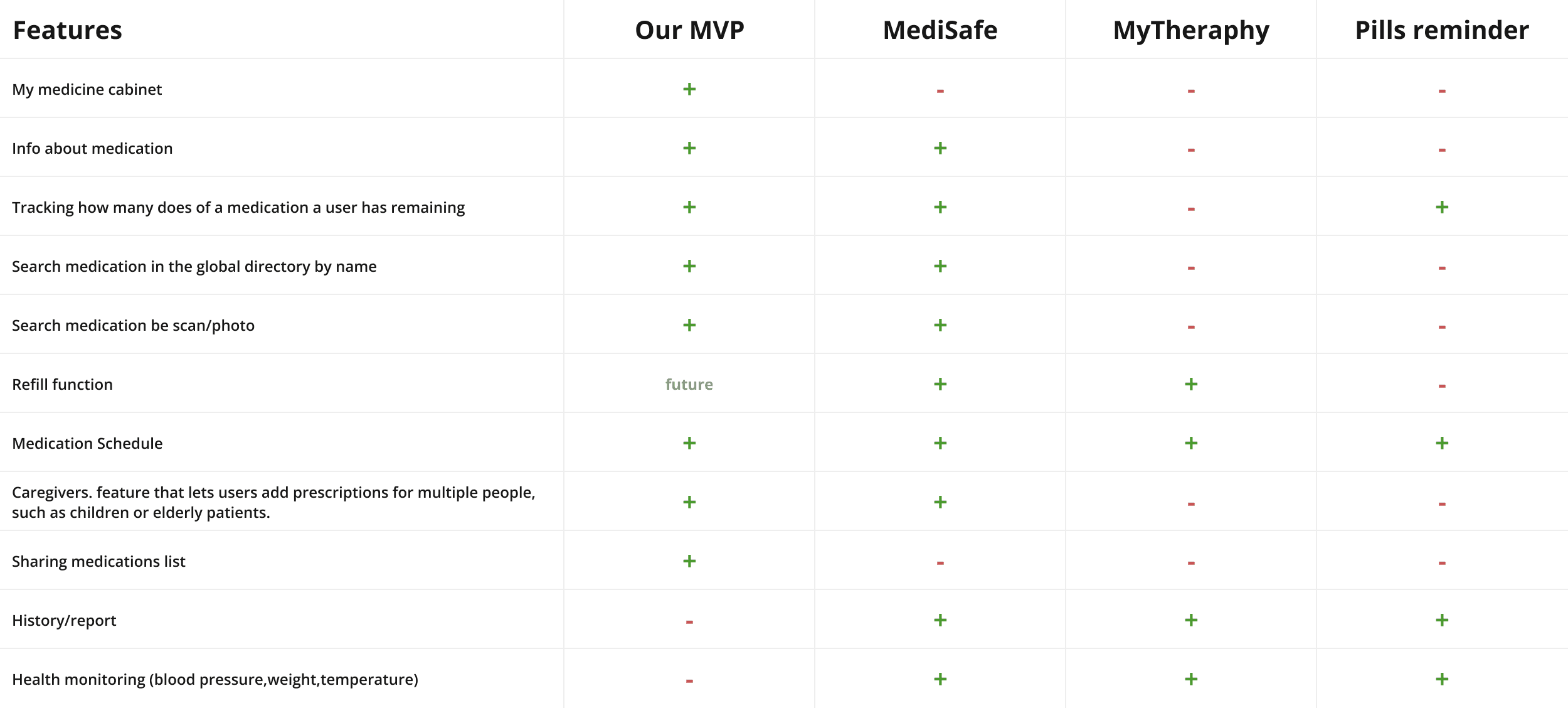 Our competitor analysis revealed that most existing apps focus heavily on medication schedules and reminders but overlook a key aspect it's helping users organize and manage their entire home medicine cabinet, including first aid essentials. Another common frustration is that many apps require users to add a medication to their treatment plan before they can even read its instructions, making it harder to quickly access important details.